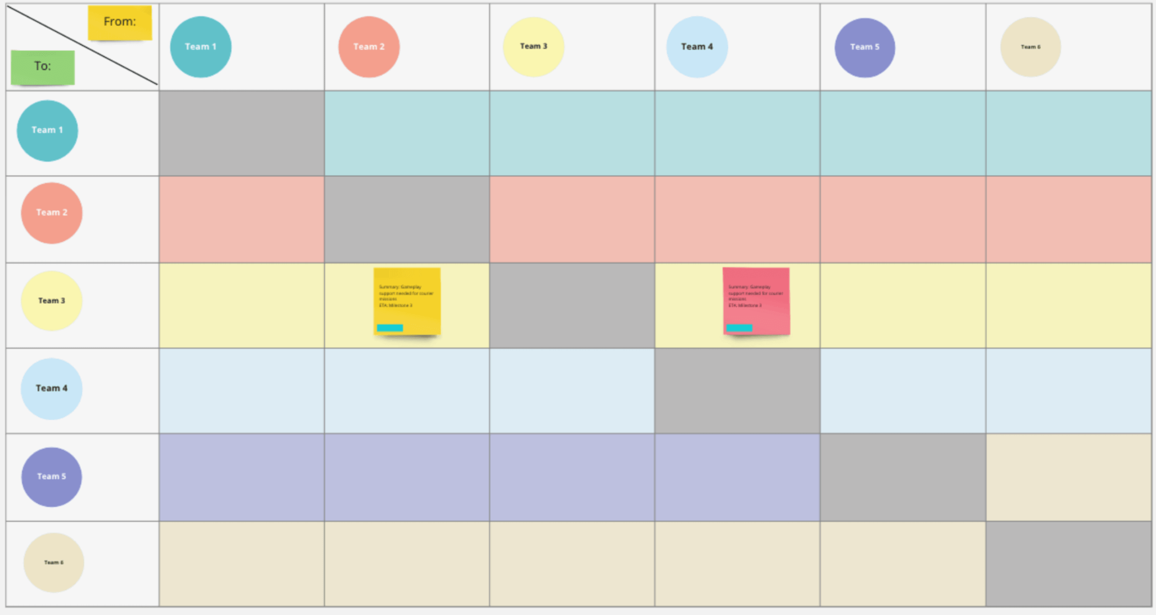Agile Coaches and Producers can use Miro to help focus and manage their dependencies during milestone planning with stickies. Color-coded stickies can be used to depict different workflows that allow teams to quickly identify the situation visually on the board.