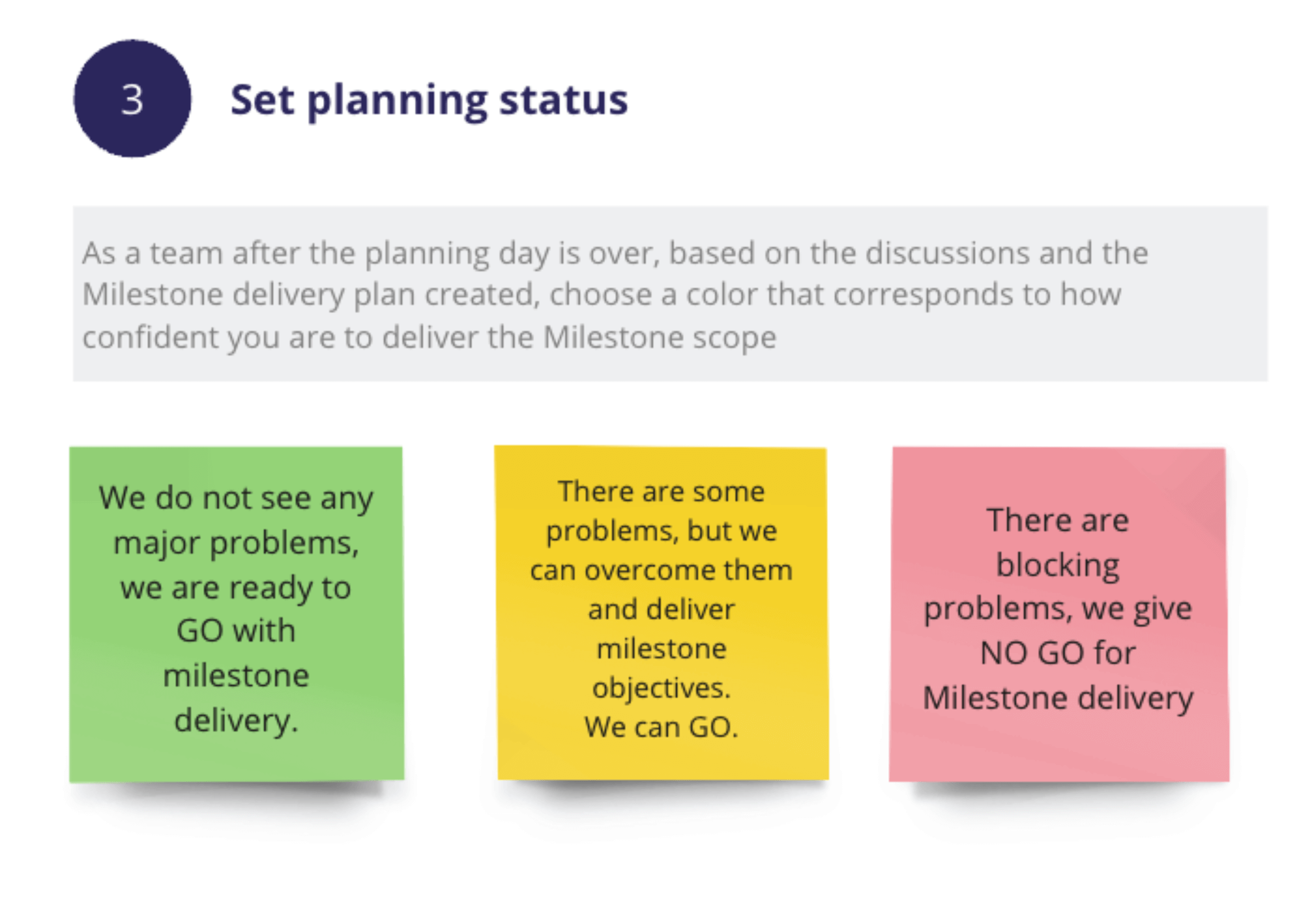 The discussions held by leadership during day one of milestone planning help to inform how the team will work together moving forward. Setting the planning status using color-coded stickies makes it easy and identifiable for each team member to share their confidence level.