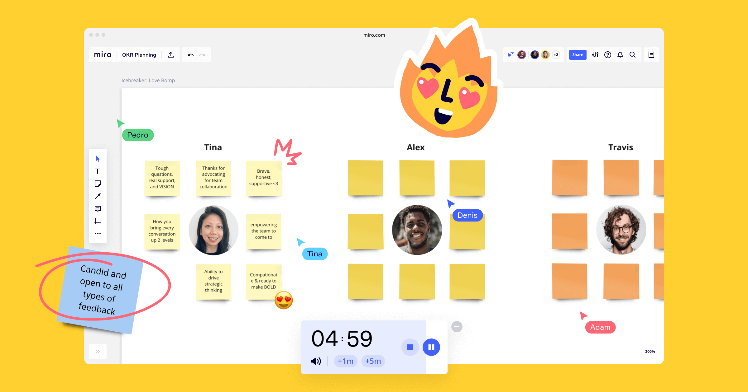 We love Icebreaker exercises! To run engaging meetings, first, get your team relaxed and acclimatized to the whiteboard. The Love Bomb Icebreaker activity is a great way to elevate your team’s morale and an opportunity for people to show appreciation for one another. This exercise consists of getting everyone to compliment each other and show them their best qualities at work.
