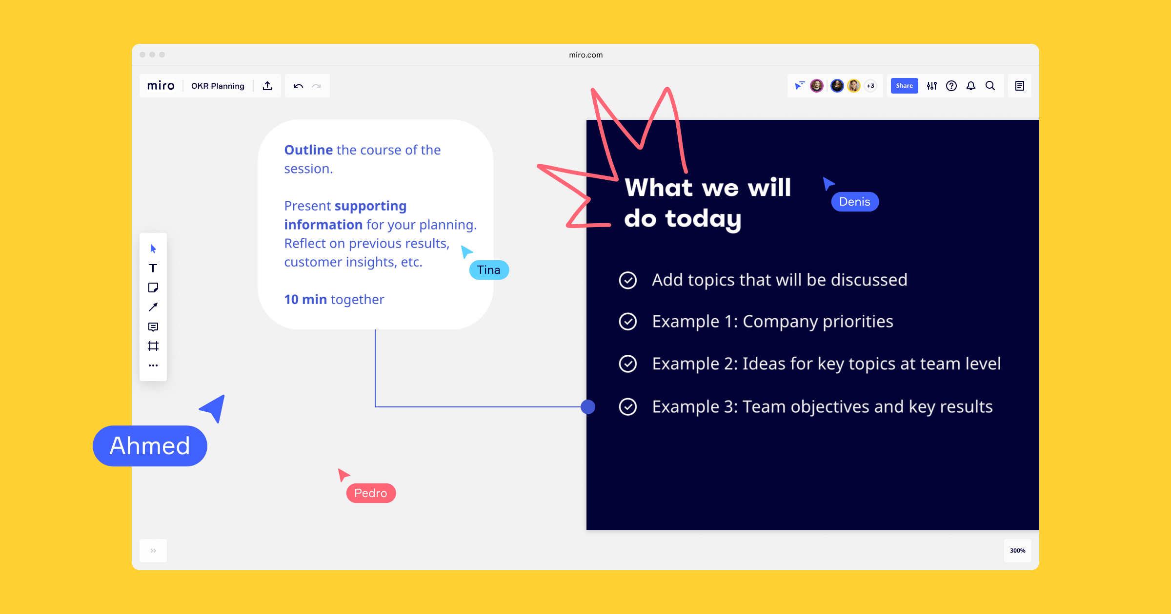 Do: Use Miro’s board resources to make your presentation more visual. Add shapes, colors, and images when highlighting why OKRs are necessary.