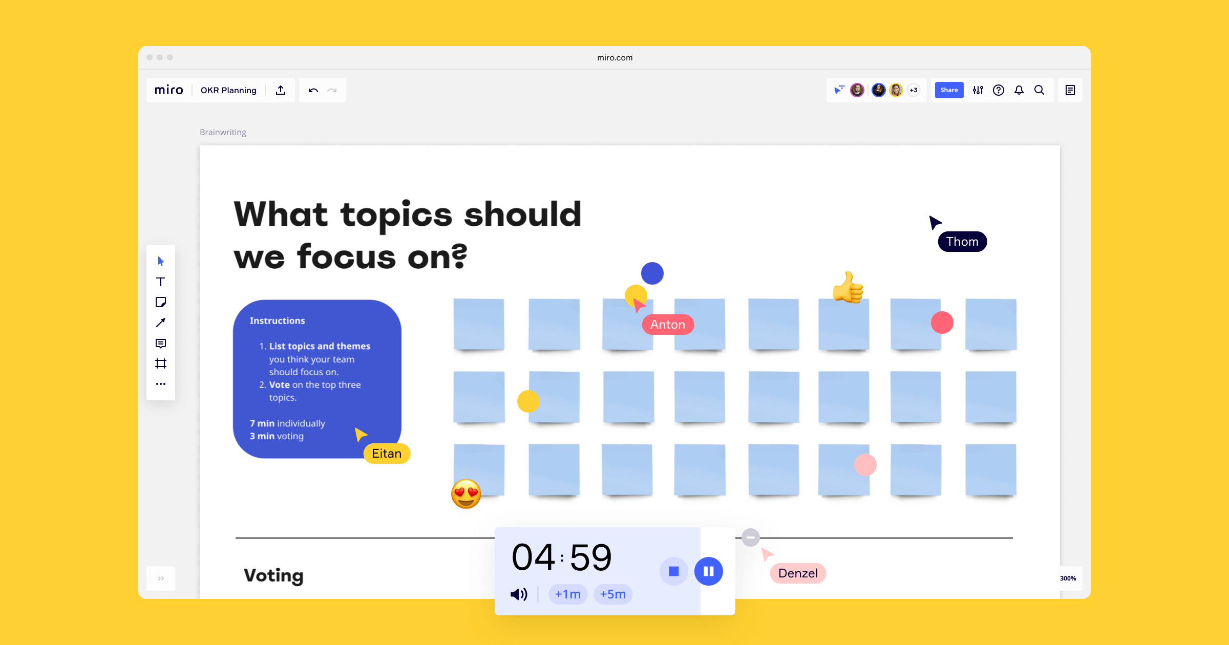 Ask everyone to list topics they think they should focus on for the next period. This activity will help everyone see what might be on the team’s radar—afterward, do a voting session to see which topics your team wants to prioritize.