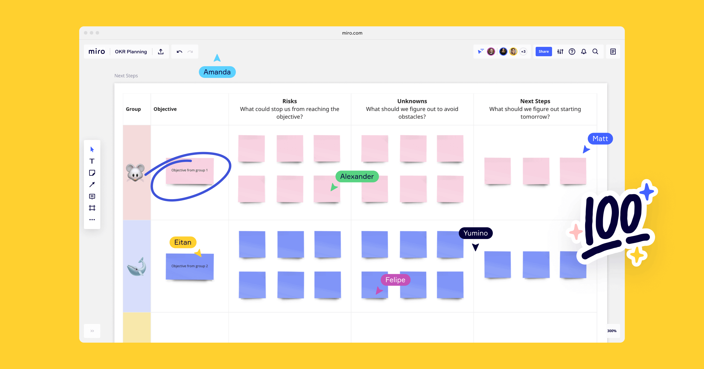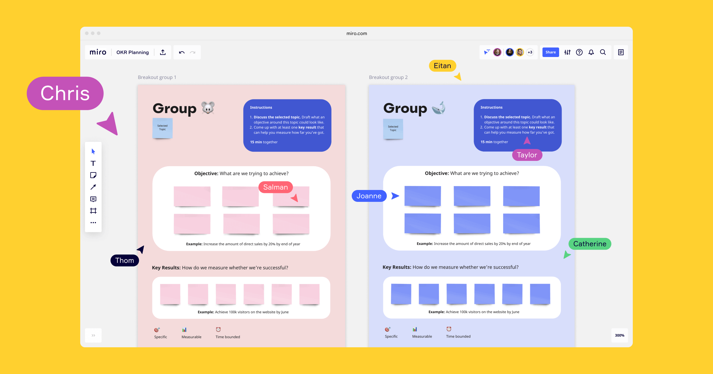 Below you can see a step-by-step OKR framework so that you can lead an OKR workshop seamlessly with the Miro OKR planning template.