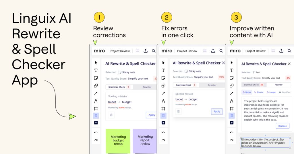 With the AI Rewrite & Spell Checker app from Linguix, you can get real-time copy help in Miro with a grammar checker and AI-based paraphraser. With six languages to choose from, you can even prepare content for international teams.